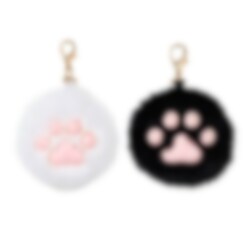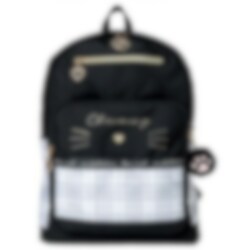 Svart och grårutig kattryggsäck med fluffigt tass-hänge