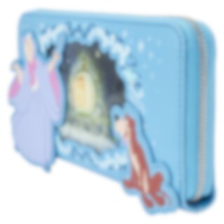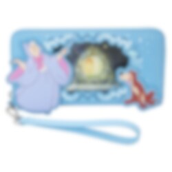 "Bibbidi-Bobbidi-Boo," vår Loungefly Disney Askungen, är en kunglig dröm som går i uppfyllelse! På framsidan, i förgrunden, tittar Den Gode Feen och Bruno in genom ett fönster medan Den Goda Feen börjar omvandla en pumpa. Lenticular-detaljer ger en alternativ vy där omvandlingen är klar: En vagn väntar för att hämta upp Askungen. På baksidan hittar du Jaq och Gus, samt Perla på en trådrulle. Inuti erbjuder denna handledsplånbok gott om plats för att säkra dina värdesaker. Den större storleken rymmer till och med de flesta mobiltelefoner. Det finns 8 fack för kort och 1 fack för att visa din legitimation. En utskuren form av en glasstövel lägger till en magisk touch. Dansa natten lång - eller helt enkelt förvandla alla dina utflykter till kungligt roliga äventyr.